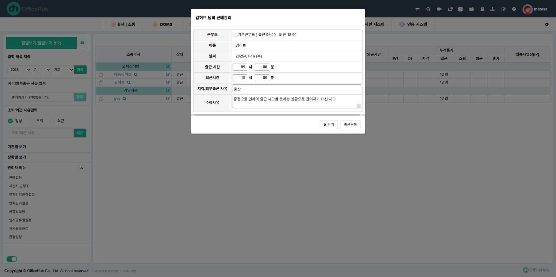 📞 출장자 근태 처리 방식이나 수정 방법이 궁금하시다면 오피스허브 고객센터 1566-4582로 문의 주세요.