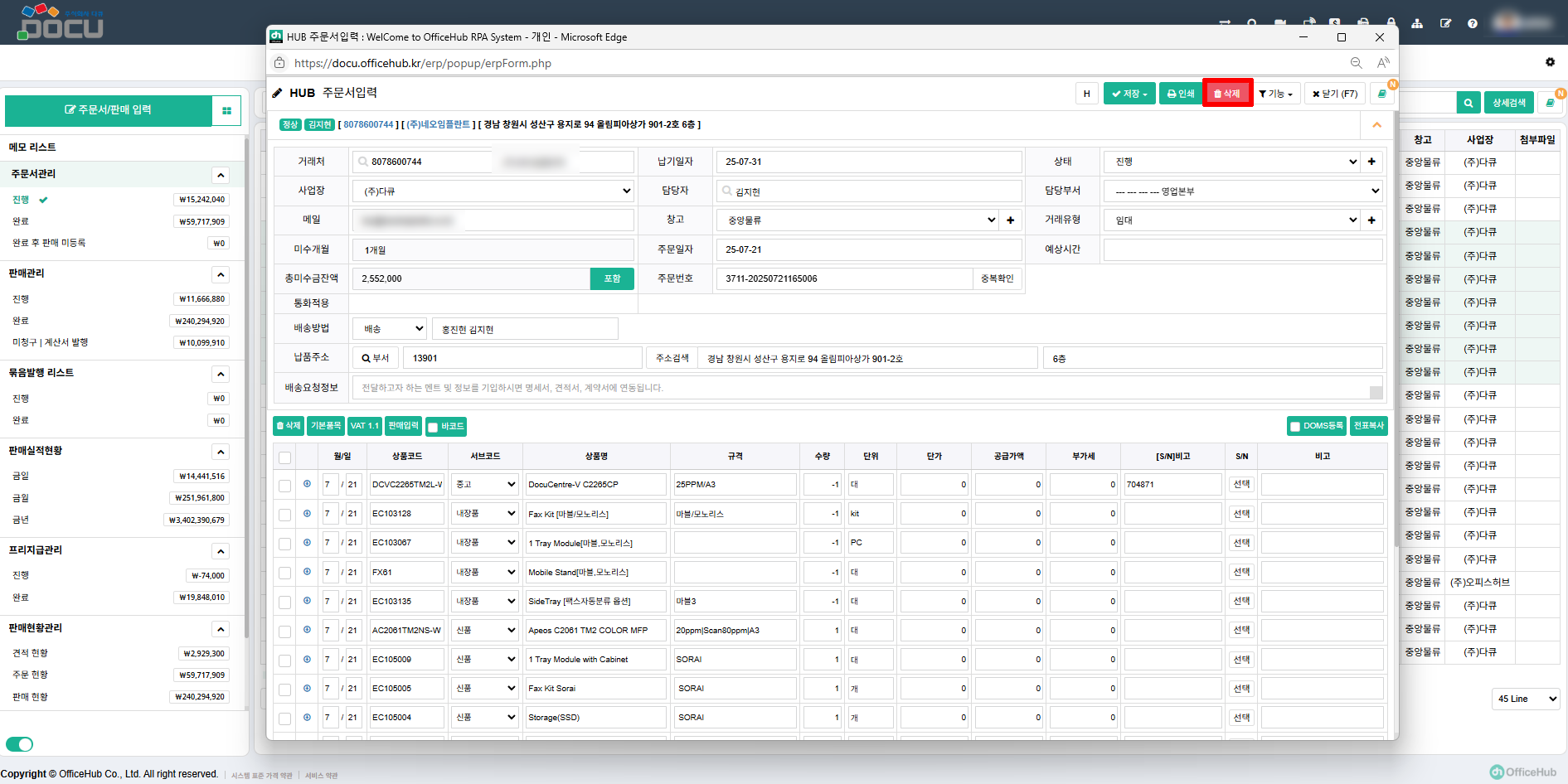 즉, 리스트 화면이 아닌 주문서 상세 팝업에서 삭제가 가능합니다.